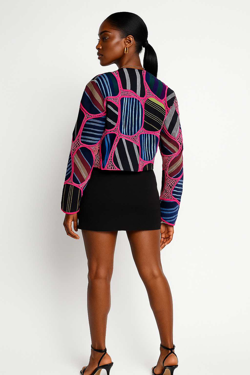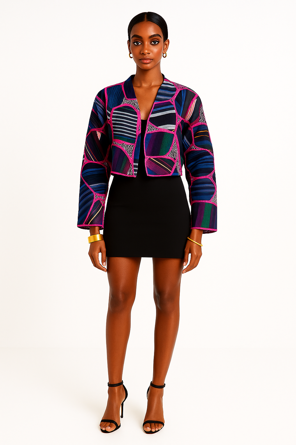 Get ready to stand out in this AT Patchwork Cropped Jacket! Crafted with woven aso-oke fabric, this jacket is truly unique. With its cropped design, it's the perfect statement piece for any outfit. Elevate your style with this one-of-a-kind jacket.
